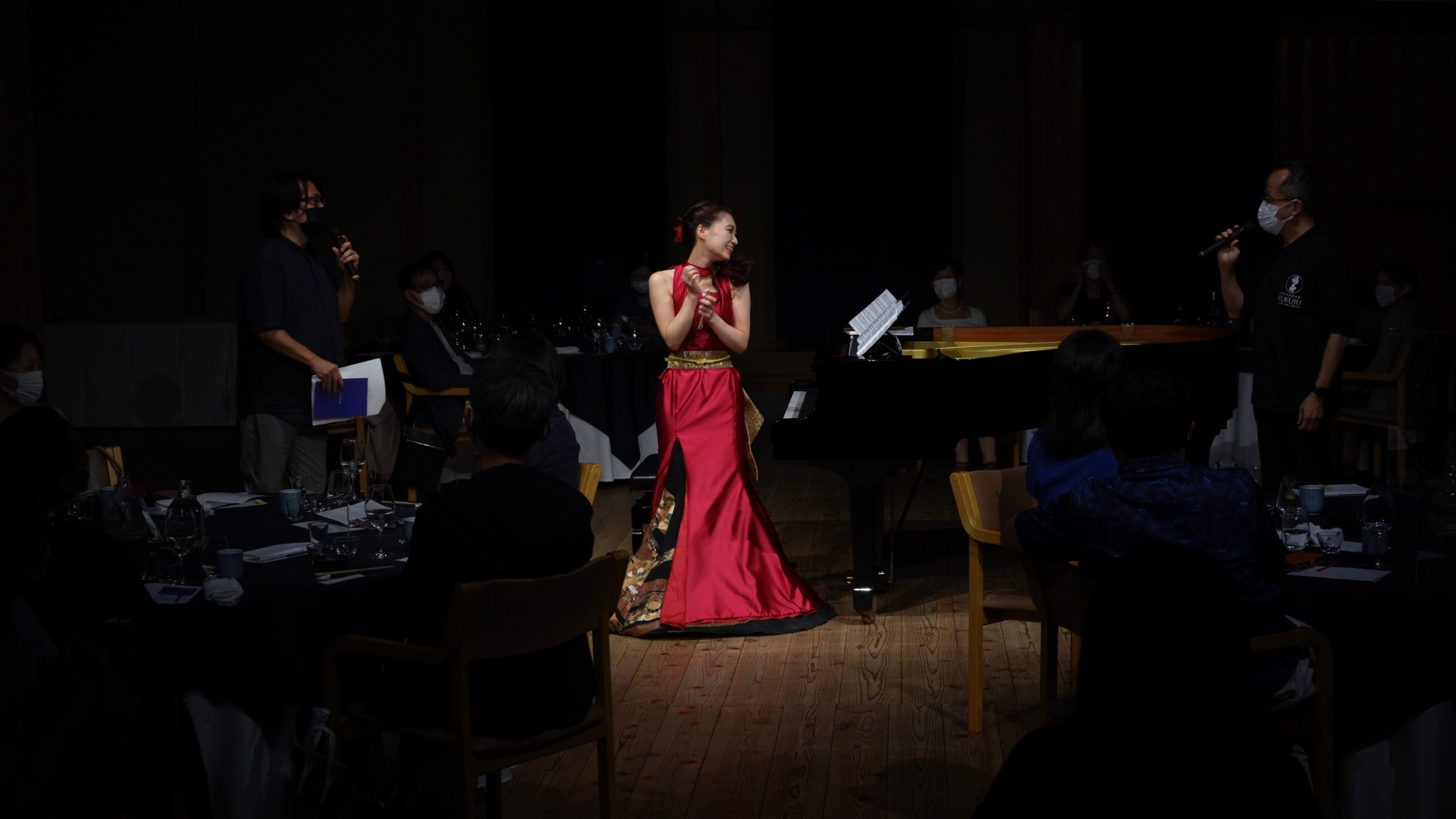 お食事の後も福寿をワイングラスで楽しみながら、クリエイターで音楽プロデューサーの南出卓と、神戸酒心館 日本酒ナビゲーターメソレッラ チンツィアによる日本酒とクラシック音楽のトークショー、ピアニスト米本彩夏とゲストピアニスト