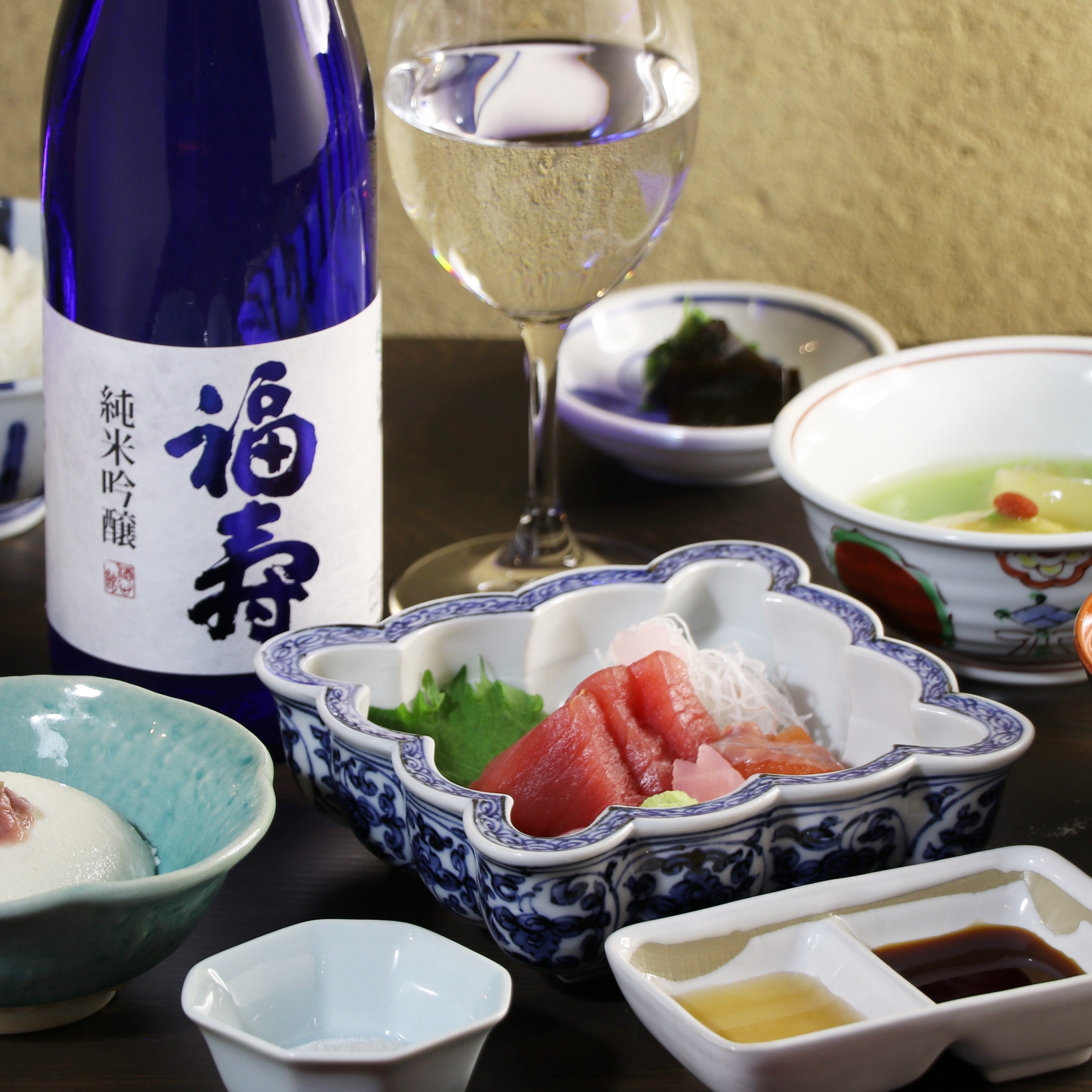 世界のソムリエが審査するインターナショナルワインチャレンジ2024で金賞を受賞した「福寿 大吟醸」をはじめ、「福寿」の日本酒全5種を、それぞれ心ゆくまでお楽しみいただけます。